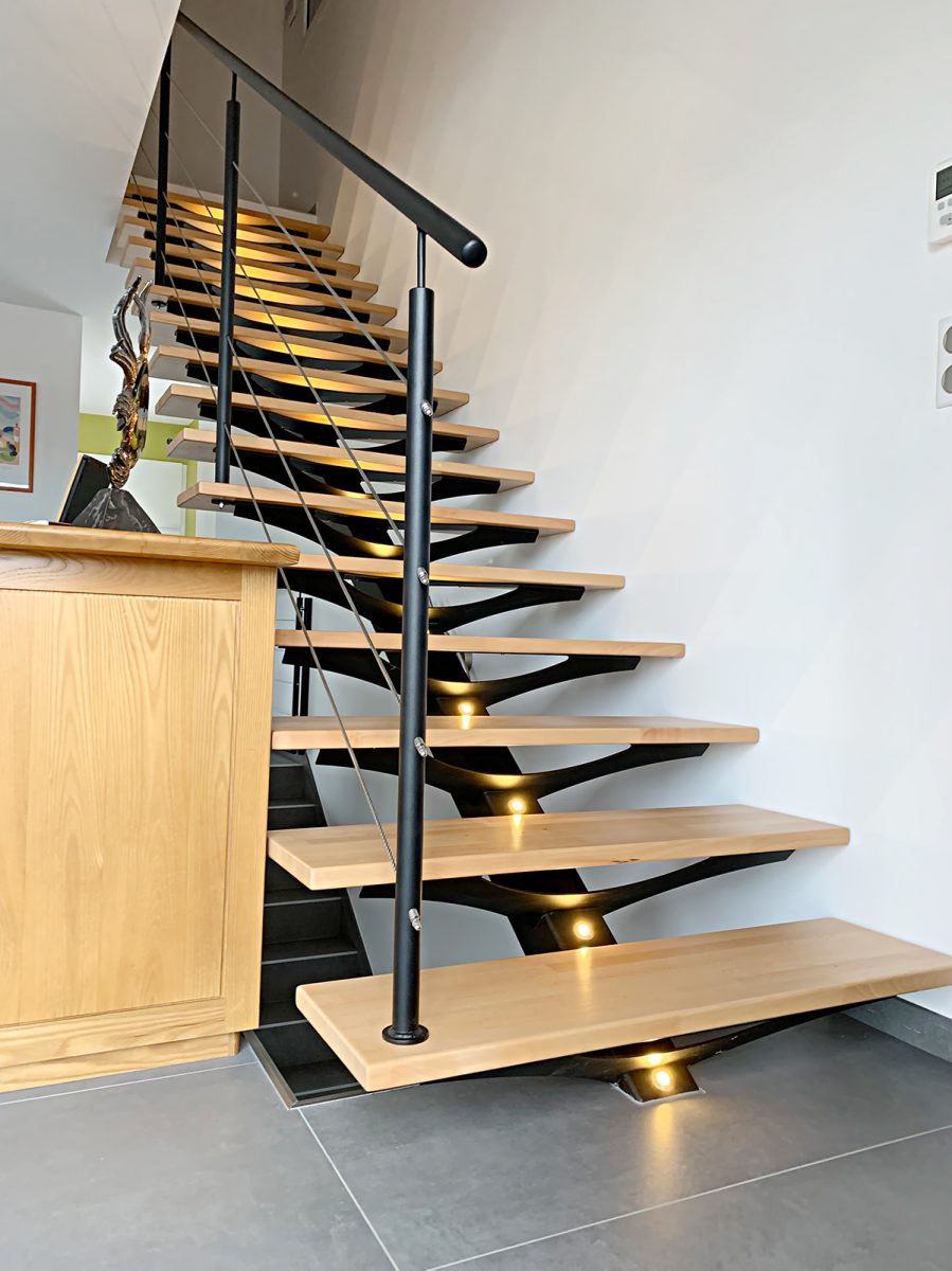 Escaliers suspendus, design et contemporains, double limons latéraux ou limon central, escalier droit, tournant, 1/4 tournant, ou escalier hélicoïdal, nous avons le savoir-faire pour votre projet.
